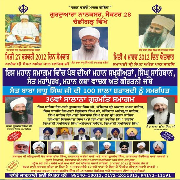 Dedicated to the 100th birth anniversary of Baba Sadhu Singh ji, 36th yearly Gurmati communion was held on 26th feb; 2012 up to 4th march;2012 on the premises of Gurdwara Nanaksar sector-28 Chandigarh. This communion included prominent personalities, Singh Sahiban, Colossus Saints and Saga narrators. Singh Sahib Giani Gurbachan Singh Ji, Jatthedar Shri Akal Takhat Sahib, Singh Sahib Giani Trilochan Singh Ji, Jatthedar Anandpur Sahib, Singh Sahib Giani Iqbal Singh, Takhat Shri Patna Sahib, Giani Pinderpal Singh and Giani Karnail Singh Gareeb. Giani Sukhwinder Singh, Giani Sukhjinder Singh.