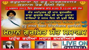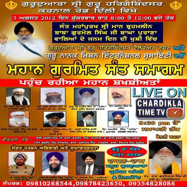 In collaboration with Gurdwara Shri Hari Gobindsar Karnal road Delhi, Guru Nanak Mission International Society presented Great Gurmati Saint Communion on 3rd Aug, 2012 from 8:00 PM up to midnight. It was organised for the commemoration of Theologian Saint Shri Baba Gurmail Singh Ji "Bagha Purana walian". It was broadcasted live on Chardikala Time TV.