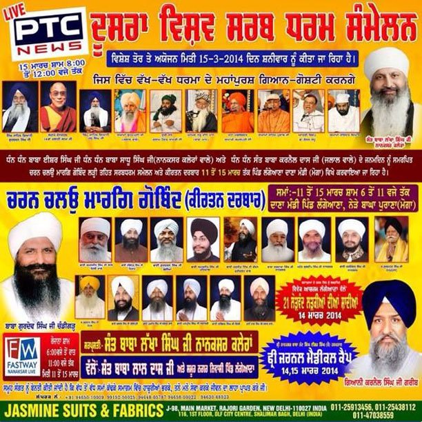 Second world All Religion congregation was held on 15th March 2014 for their views on cognition, broadcasted live on PTC NEWS CHANNEL from evening 8 to midnight. In addition to this event, "Charan chaliu Marg Gobind de"(Follow the footprints of Guru Gobind Singh Ji) , A Kirtan durbar was organised from 11th March 2014 to 15th March 2014, 6:00 pm to 11:00 pm in village Langeana near Grain Market, near Bagha Purana Moga. In addition to this other events like, Free general Health check up on 14th and 15th March 2014 and Marriage ceremony of 21 girls of poor background on 14th March was held by the blessings of Giani Karnail Singh Ji Gareeb.